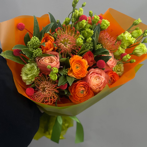 Букет "Караван" из ранункулюсов,скиммии, лейко, роз Эквадор Кахала и эустом