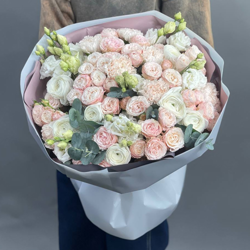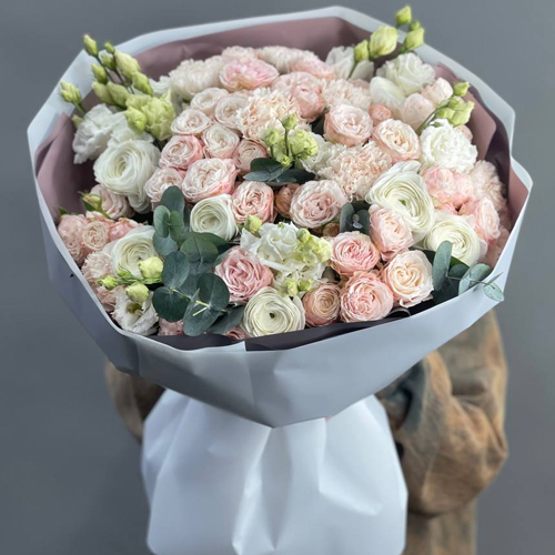 Букет "Амина" из ранункулюсов, кустовых пионовидных роз Бомбастик, эустом и эвкалипта