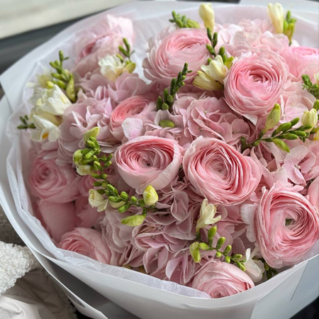 Букет "Здесь и сейчас" из ранункулюсов, гортензии и фрезии