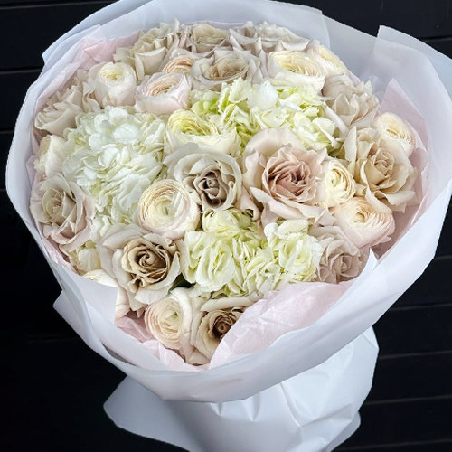 Букет "Сезон любви" из роз Эквадор Квиксенд, ранункулюсов и гортензий