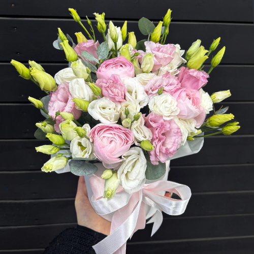 Композиция в шляпной коробке из розовых ранункулюсов и эустом