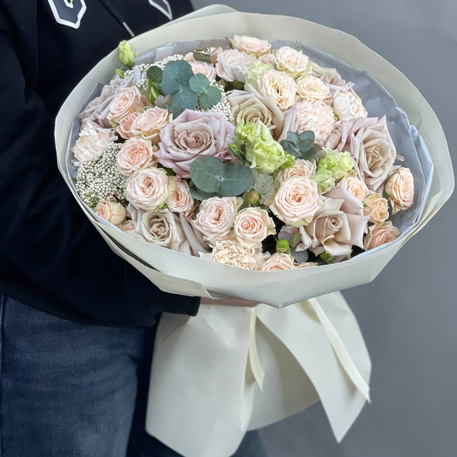 Букет "Юленька" из роз Эквадор, кустовых роз сорта Таня, озатамнуса, эустом, эвкалипта и диантусов