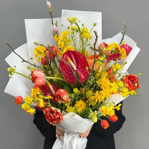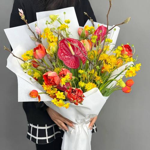 Букет с кустовыми ранункулюсами, антуриумом, тюльпанами и нарциссами