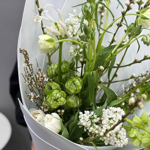 Белый букет с сиренью, ранункулюсами и тюльпанами