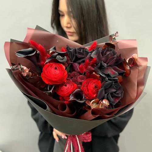 Букет с красными ранункулюсами " Кровавая Мэри"