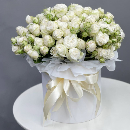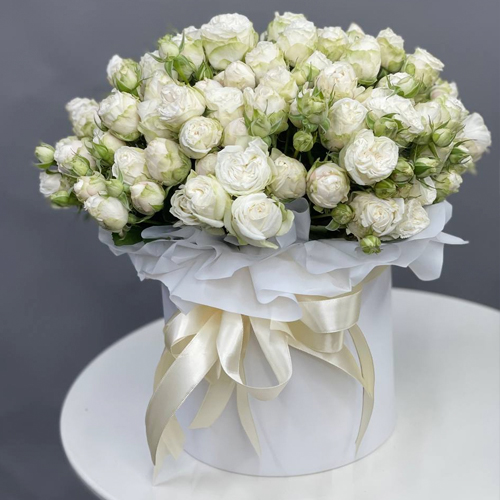 Композиция в шляпной коробке из кустовых пионовидных роз Мисс Бомбастик
