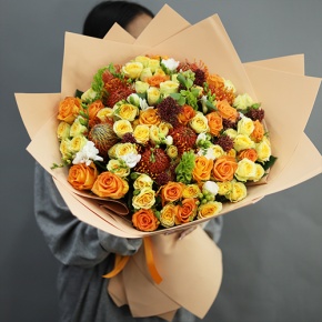 Букет "Осенние грёзы" из лейко, роз, фрезий, скиммии, молюцеллы и лейко