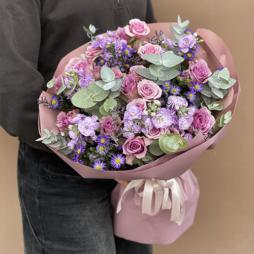 Букет "Хрустальный" из роз, астера и ароматных маттиол