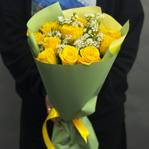 Букет "Нотка счастья" из лимонных роз и хамелациума (40 см)