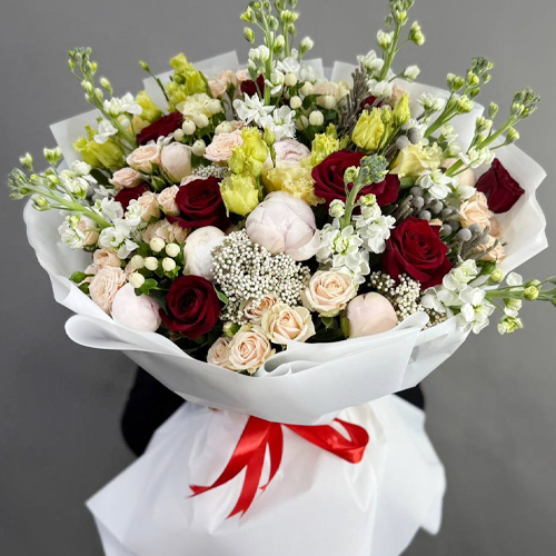 Букет "Сан-Диего" из роз, пионов, гиперикума, кустовых роз сорта Таня, озатамнуса и ароматных маттиол