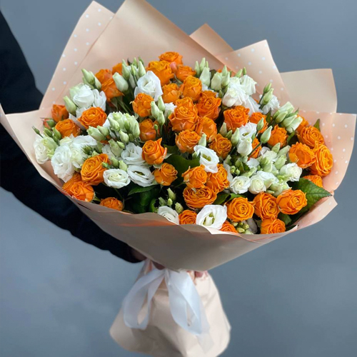 Букет "Ницца" из кустовых оранжевых роз и эустом