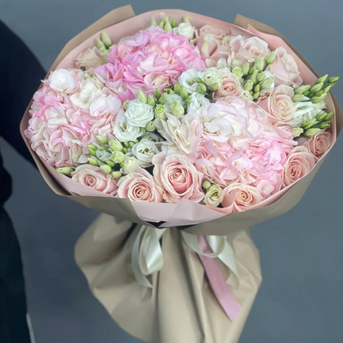 Букет "Елена" из роз Аваланж, эустом и гортензии