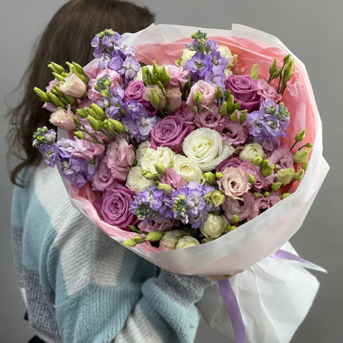 Букет "Фернандо" из эустом, ароматных маттиол и микса роз