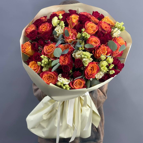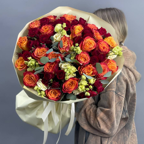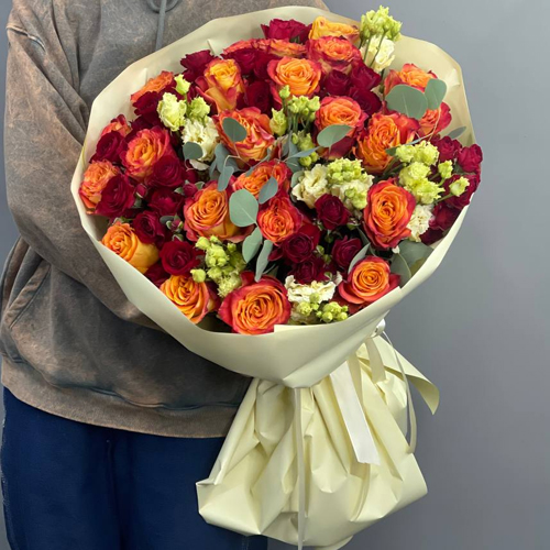 Букет "Ванесса" из роз Эквадор, эустом и пионовидных кустовых роз