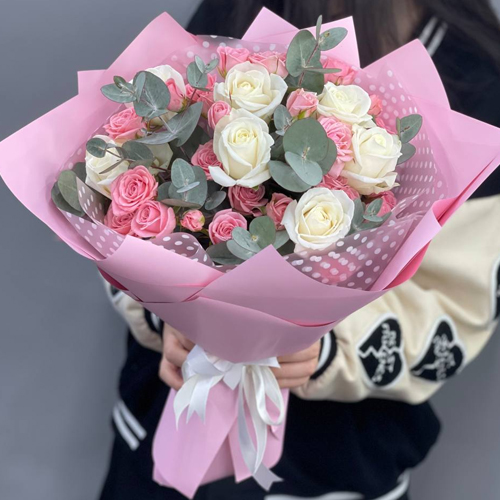 Букет "Малыш" из роз, эвкалипта и кустовых роз