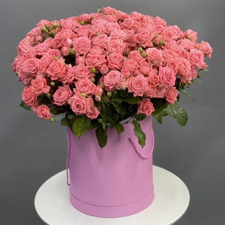 Композиция в шляпной коробке из 31 кустовой коралловой розы