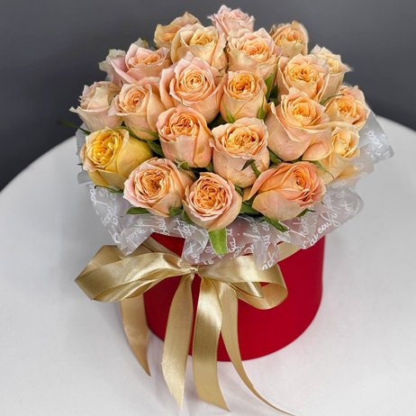 Композиция в шляпной коробке "Марго" из 25 персиковых роз