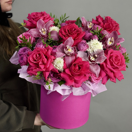 Композиция в шляпной коробке из роз Эквадор Пинк Флоид, ранункулюсов, кустовых пионовидных роз и орхидей