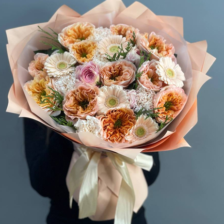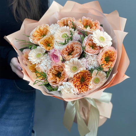Букет "Маршмеллоу" из пионовидных роз Эквадор, диантусов, ранункулюсов и гербер