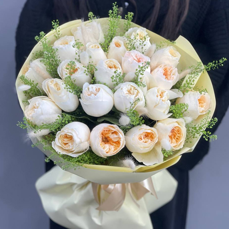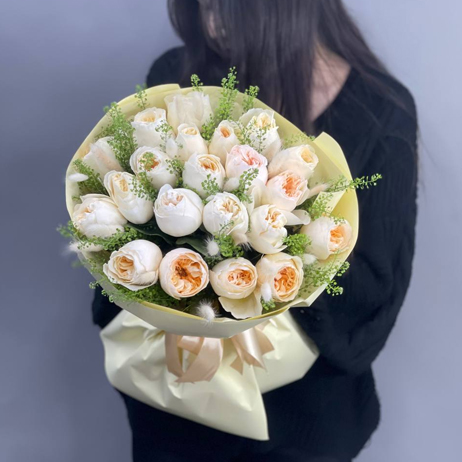 Букет "Нежный мотив" из пионовидных роз Эквадор, гринбелла и лагуруса
