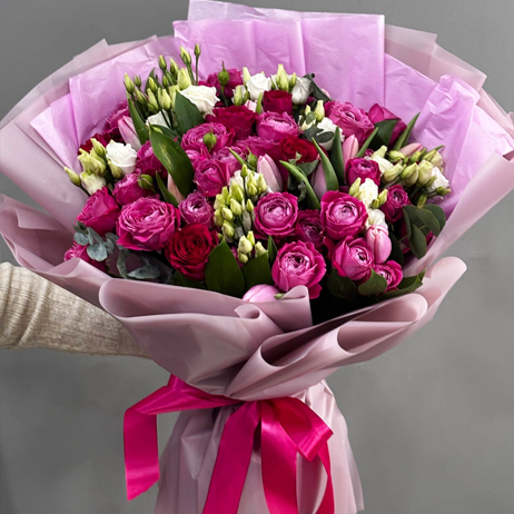 Букет "Эстония" из пионовидных кустовых роз Мисти Баблз, тюльпанов и эустом