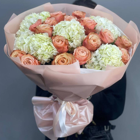 Букет из роз Эквадор Кахала и гортензии