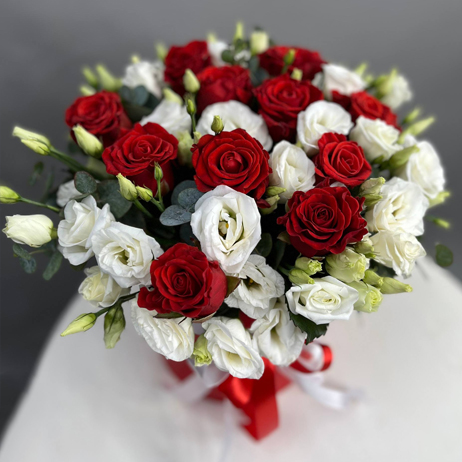 Композиция в шляпной коробке из красных роз Эль Торо и эустом