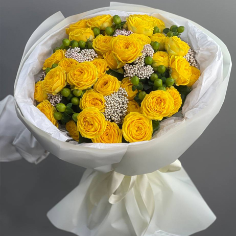 Букет "Яркий акцент" из лимонных пионовидных кустовых роз, озатамнуса и гиперикума