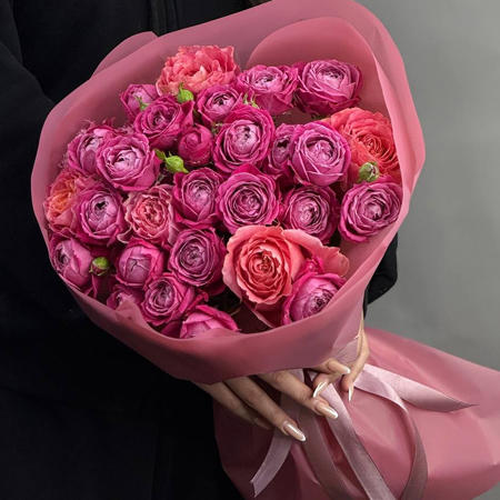Букет "Дорогуша" из пионовидных кустовых роз Марвелоус Баблз и махровых роз (50 см)