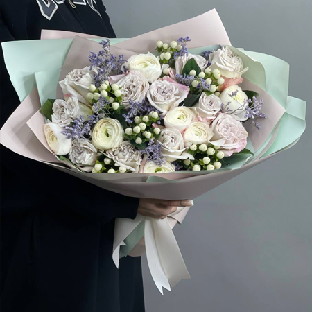 Букет "Райская пыль" из пионовидных роз Эквадор, ранункулюсов, лимониума и гиперикума