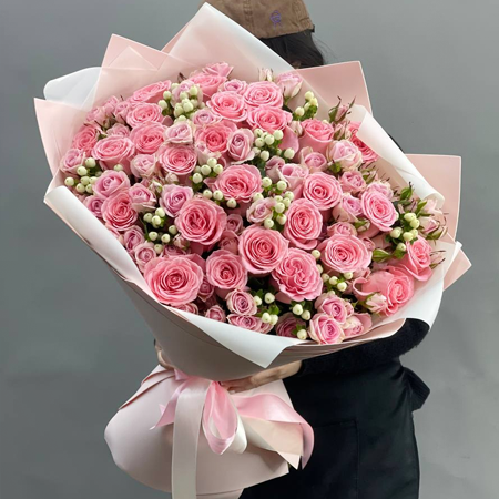 Букет "Сладкая конфетка" из кустовых роз, гиперикума и роз Софи Лорен