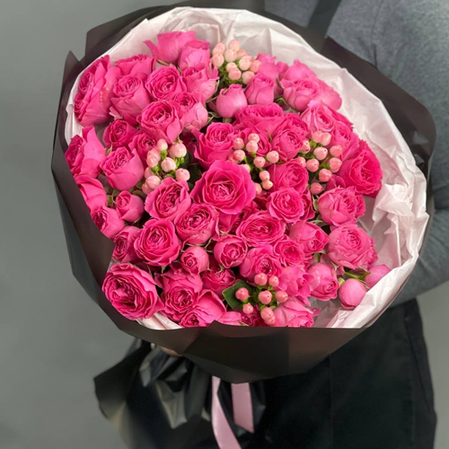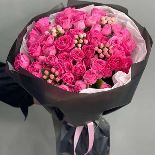 Букет из кустовых малиновых роз и гиперикума (50 см)