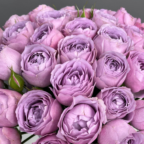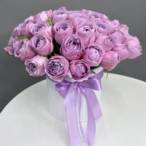 Композиция в шляпной коробке из лавандовых кустовых пионовидных роз