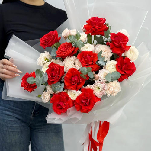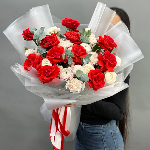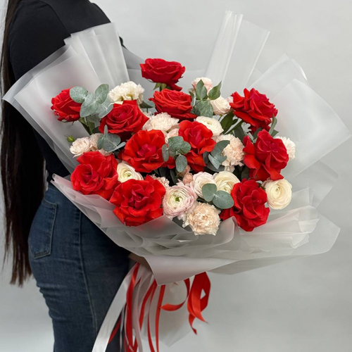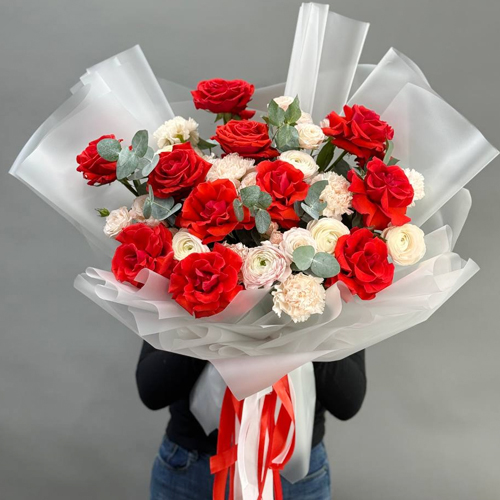 Букет "Любовь, похожая на сон" из французских роз Эквадор Нина, ранункулюсов, кустовых пионовидных роз Бомбастик и диантусов