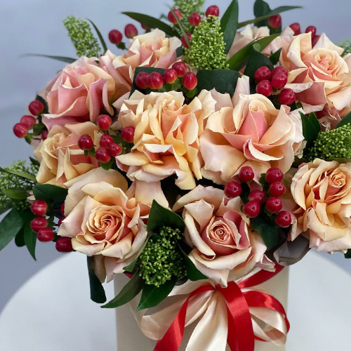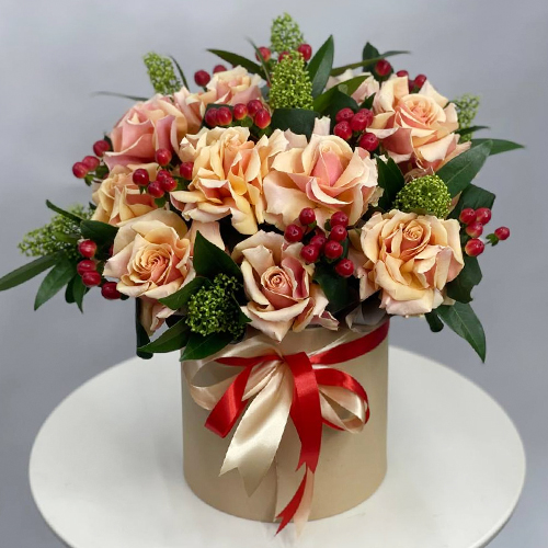 Композиция в шляпной коробке из роз Эквадор, гиперикума и скиммии