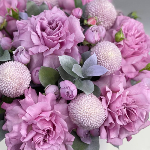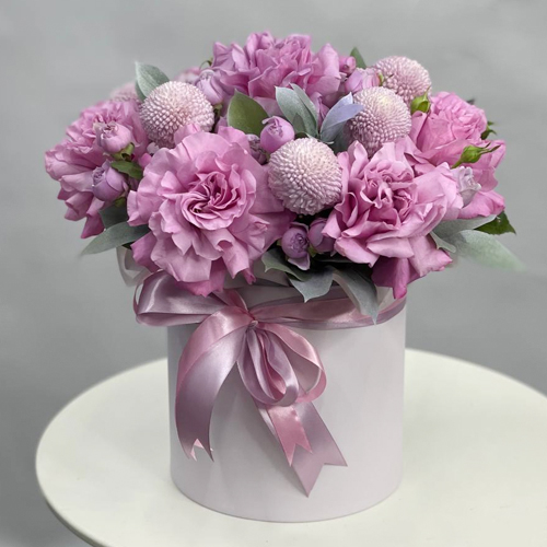 Композиция в шляпной коробке из роз Эквадор\. хризантем Момоко, кустовых роз и рускуса