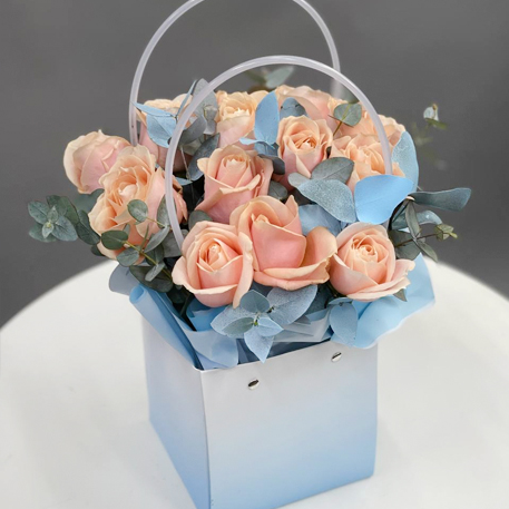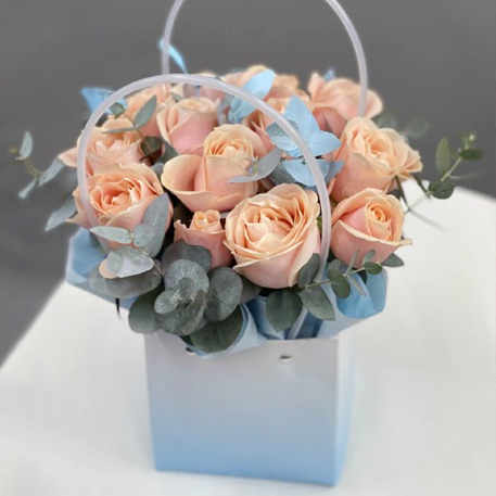 Стильная композиция в сумочке из роз Аваланж и эвкалипта