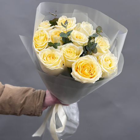 Букет 11 роз Эквадор Канделайт с эвкалиптом (70 см)