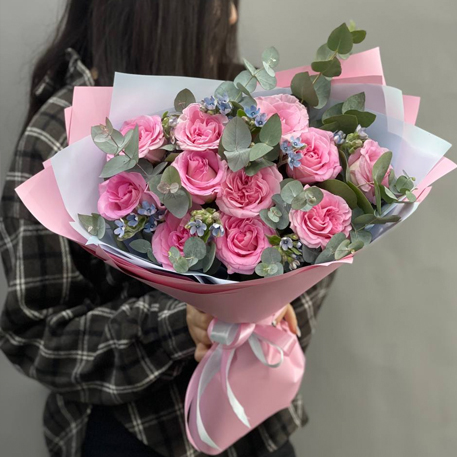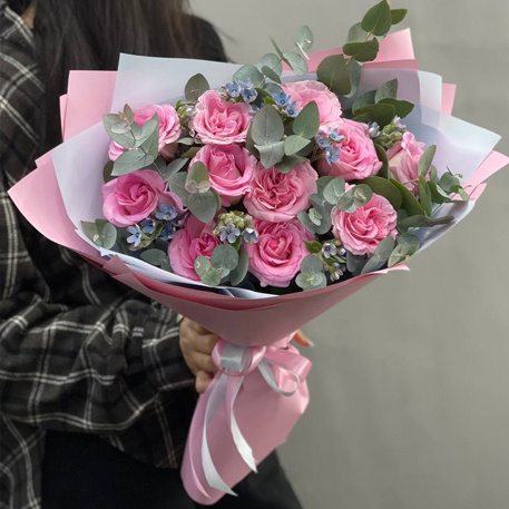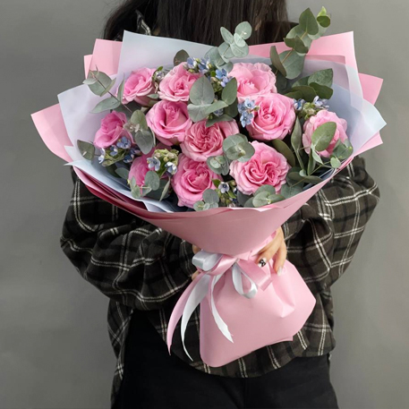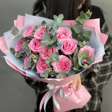 Букет "Ламбада" из роз, оксипеталума и эвкалипта