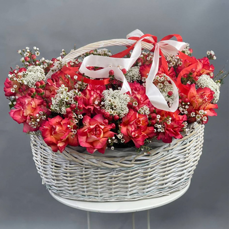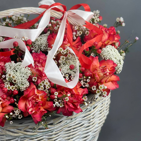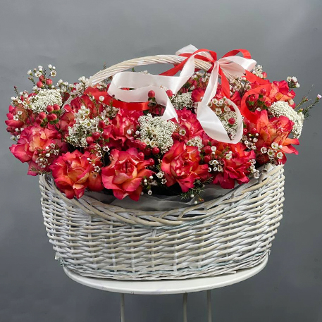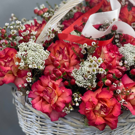 Композиция в корзине из роз Эквадор Игуазу, озатамнуса, гиперикума и хамелациума