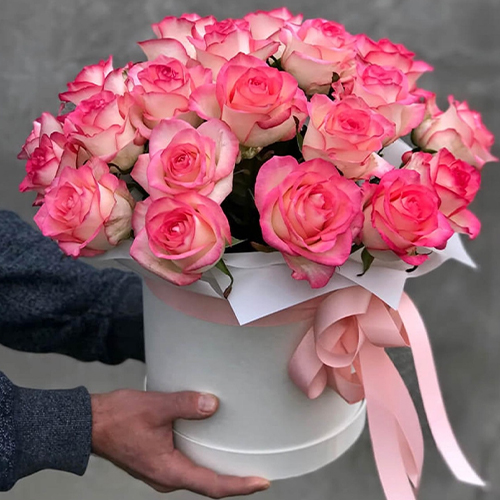 Композиция из 25 роз Джумилия в шляпной коробке
