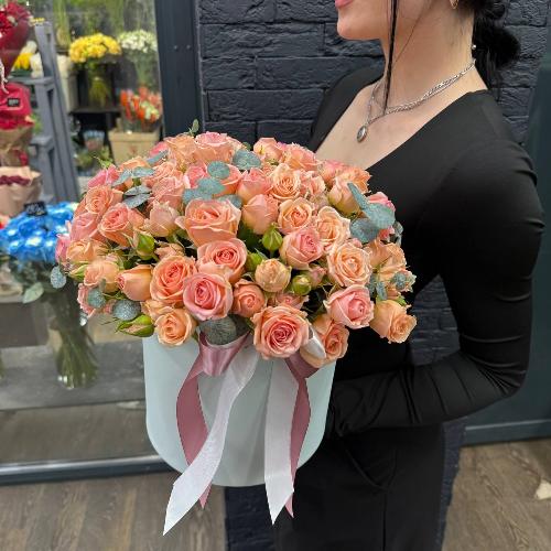 Композиция из кустовых роз в шляпной коробке " Персиковый мусс"