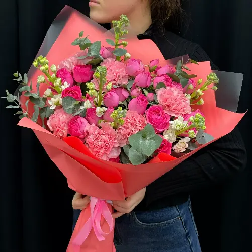 Букет " Малиновый шейк" с розами, гвоздикой и маттиолой