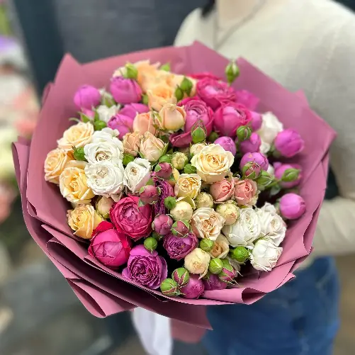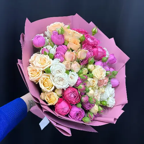 Букет из 15 кустовых роз-микс " Радуга эмоций"