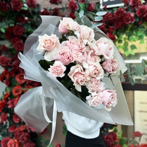 Пастельный "Французский" букет из роз Эквадор, диантуса и веточек эвкалипта