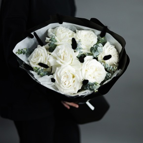 Букет "Черная пантера" из роз Эквадор Плая Бланка, эвкалипта и веточек лагуруса