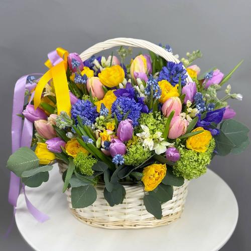 Корзина с тюльпанами, гиацинтами и нарциссами " Яркий краски весны"